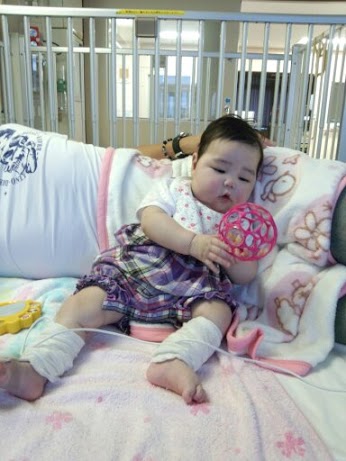 てんかん波が落ち着いて体調が良いのが嬉しくてたまらないらしく、1日中オモチャをとっかえひっかえして遊び、一人でうーうーお喋りし、音の出るオモチャを鳴らしまくり、ハシャギまくり…本当に脳神経の病棟でズバ抜けてやかましい入院児でした。