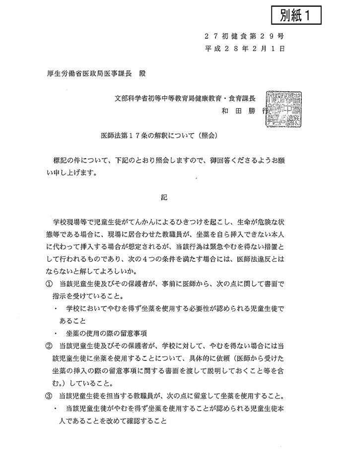 文部科学省より学校現場でてんかん発作がおきた際の坐薬使用について通達が出されました。
