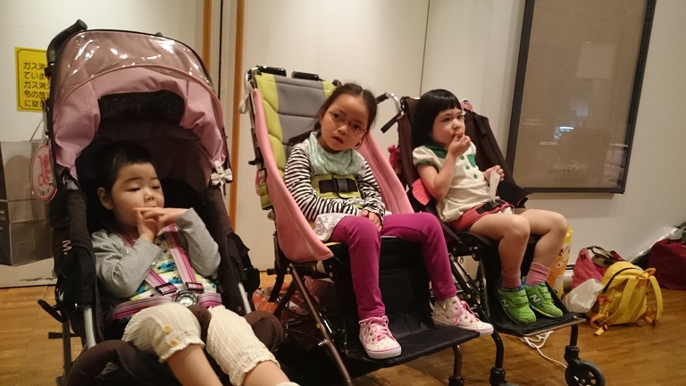 福祉バギーに座ることちゃんやmomoちゃんに比べて、明らかにももぞうだけ姿勢がおかしいです。見るからに腹圧がかかって背中も丸まり、内臓にも背中にも悪そう。。