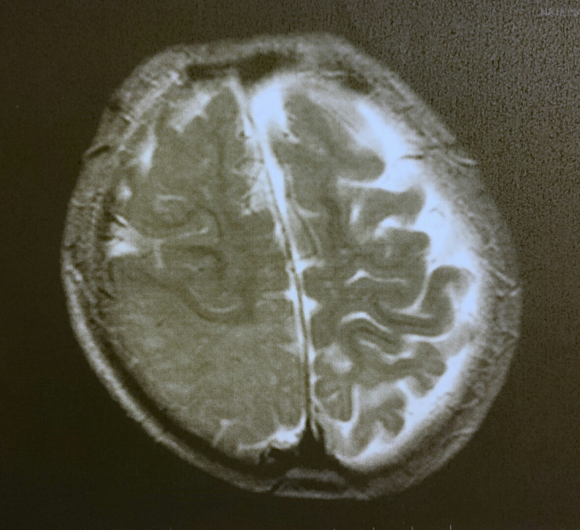 画像検査の結果、右脳の後頭部(写真左側の下半分)に、髄鞘化の異常が見つかりました。