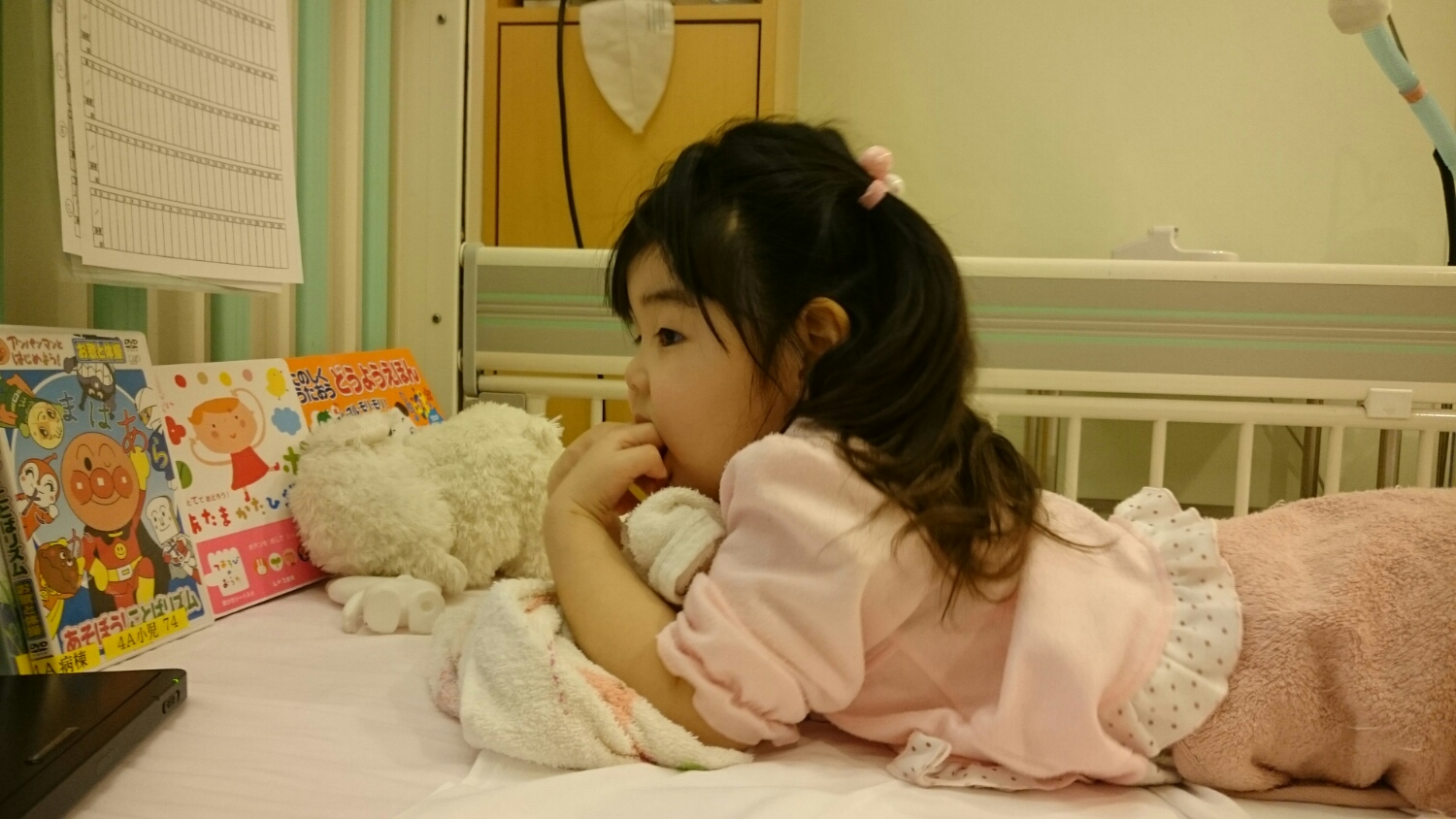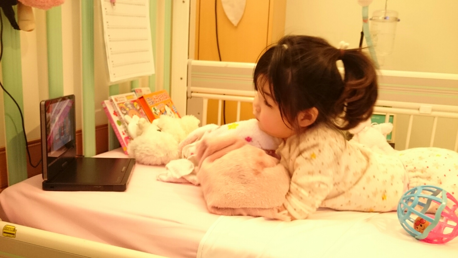(病棟で借りた寄贈品のアンパンマンDVDに夢中。寄贈してくださった方、ありがとうございます!!)