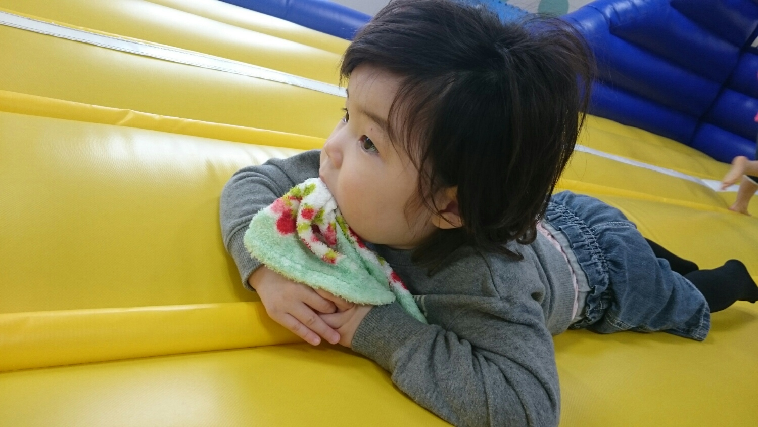 トランポリンの上でジャンプしまくるお友達(※まあやちゃんではありません。まあやちゃんは引き続き隣でダラダラしてます。笑)を、珍しそうに眺めてます。