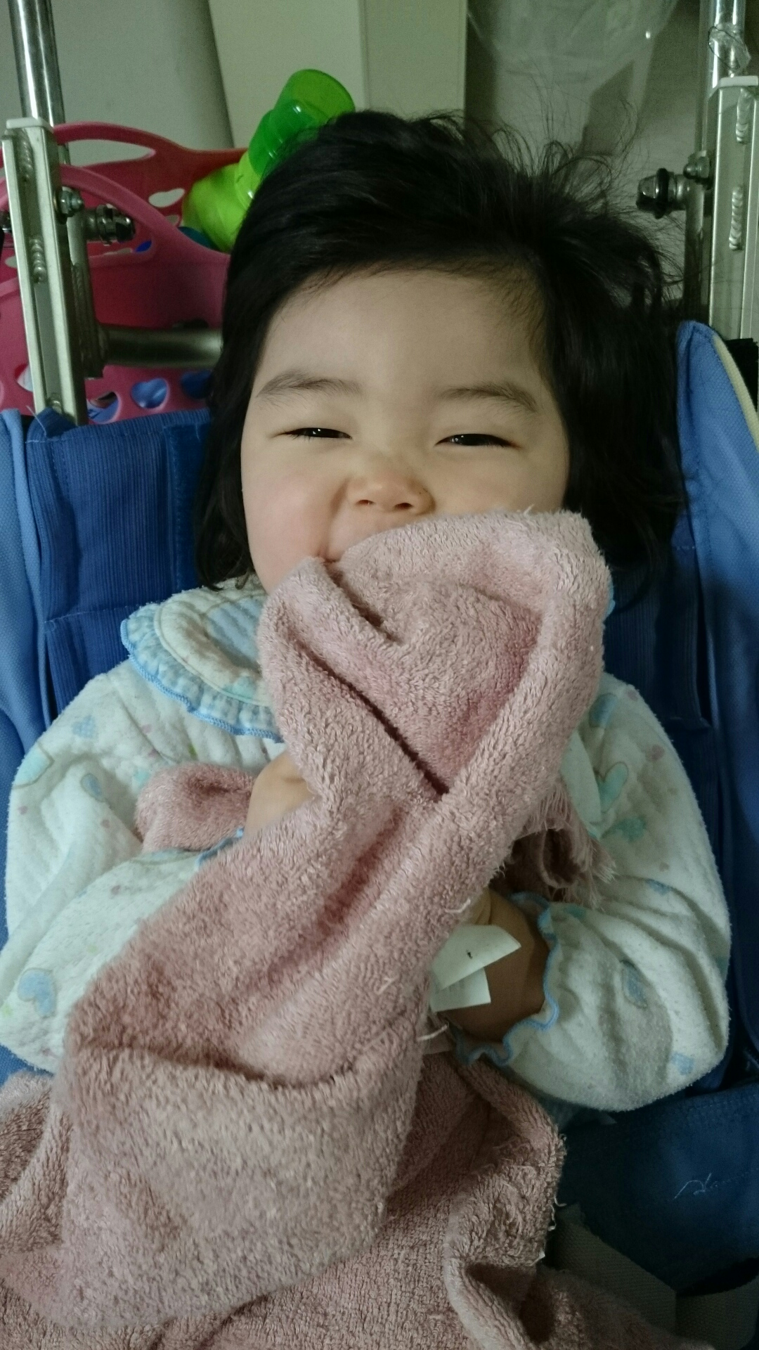 食事は特に嫌がり、大好きなウサギかタオルを口に入れてくれとパニックの大暴れ。