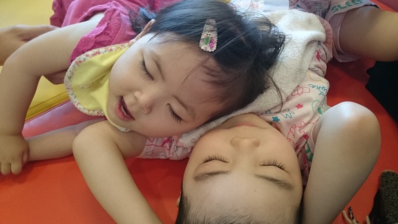 子供同士って不思議ですね。相手がぶつかったりしても怒らないし、お互いにさわさわしながらくっついて過ごしてました。