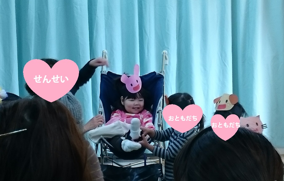 ももぞうは楽器演奏の時も参加して、これまた先生お手製の、押すと『ぴゅー』と音の鳴る笛が入った腕輪(しかも、ももぞうの好きなふわふわ素材)を装着してました。
