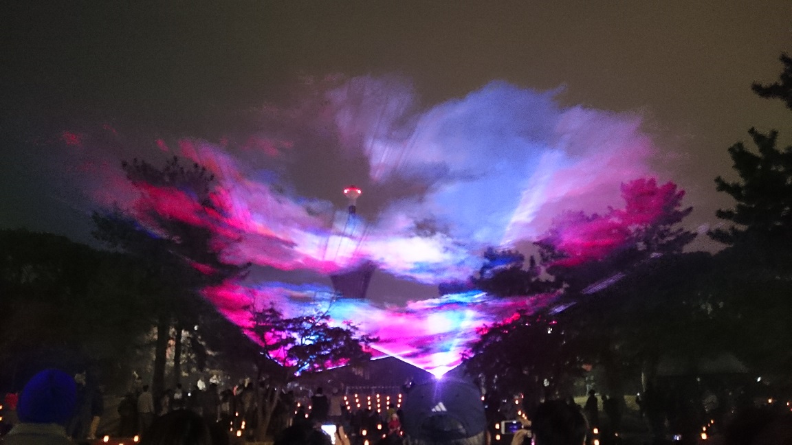 写真のようなレーザー光線を使ったショー(音楽つき)で、ちょっと人が少ないエリアに陣取って家族3人で鑑賞しました。ももぞうはパパ(身長180cm+α)の抱っこで特等席です。