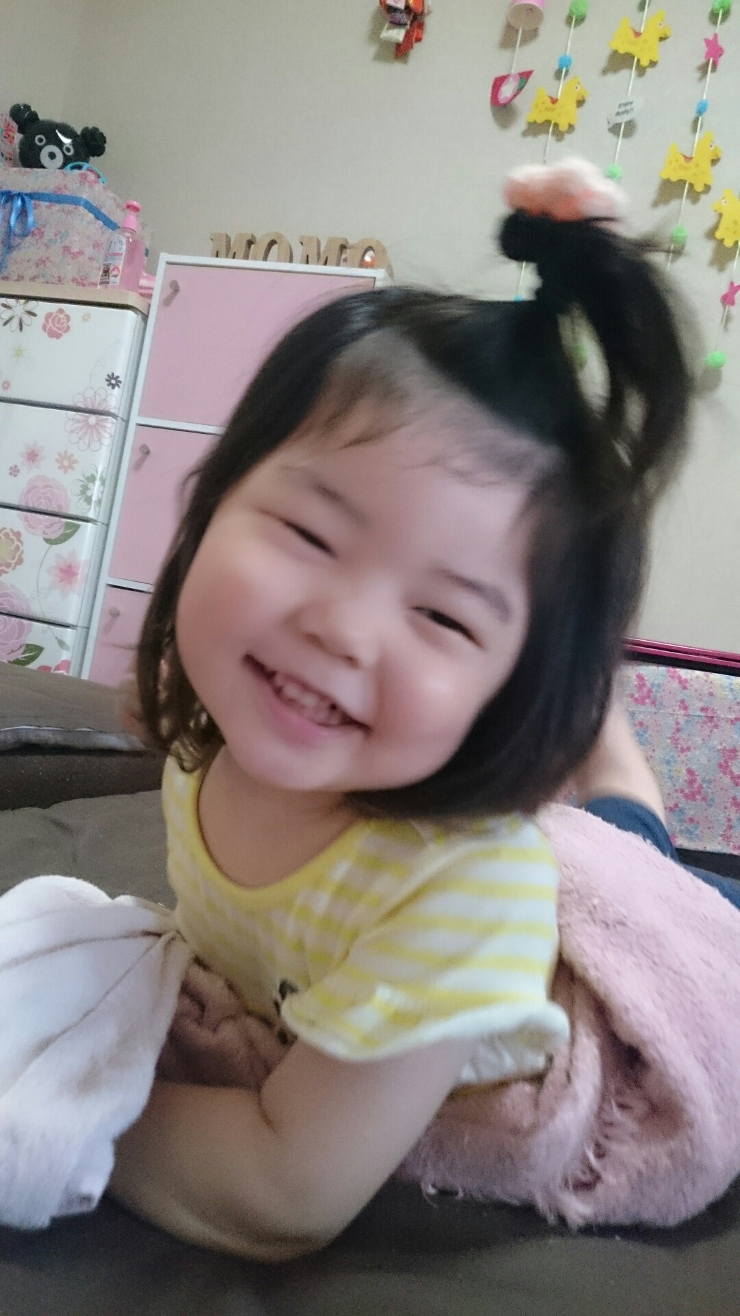はしゃぎすぎて、お団子ヘアーが崩れまくった ももぞう。笑
